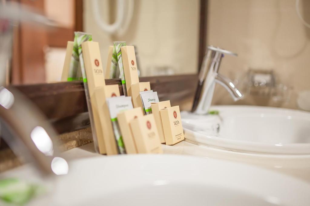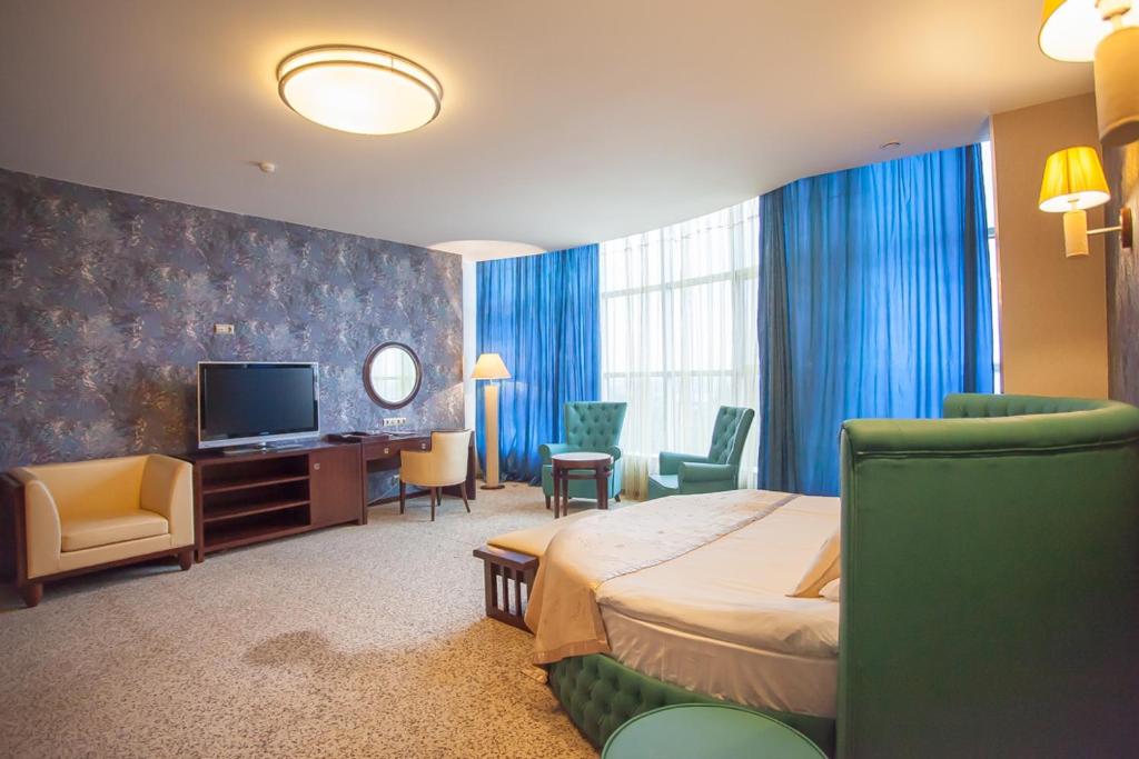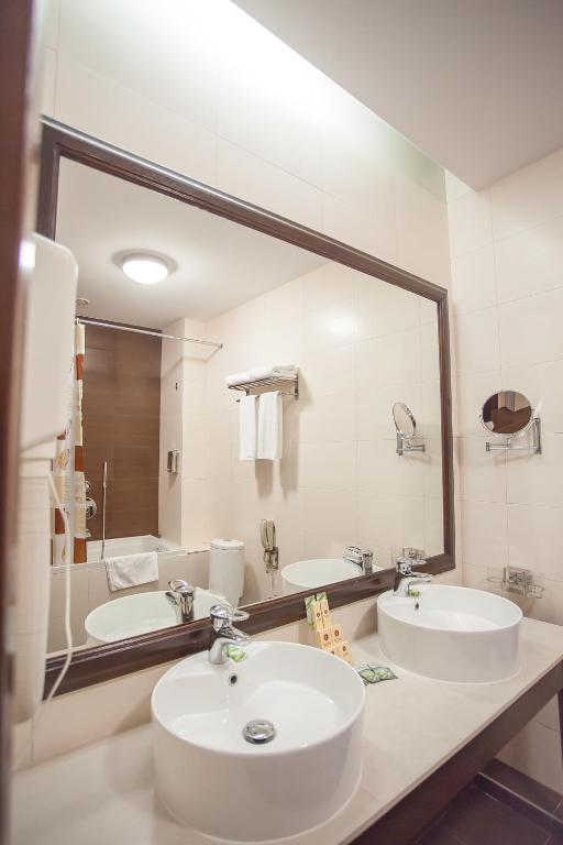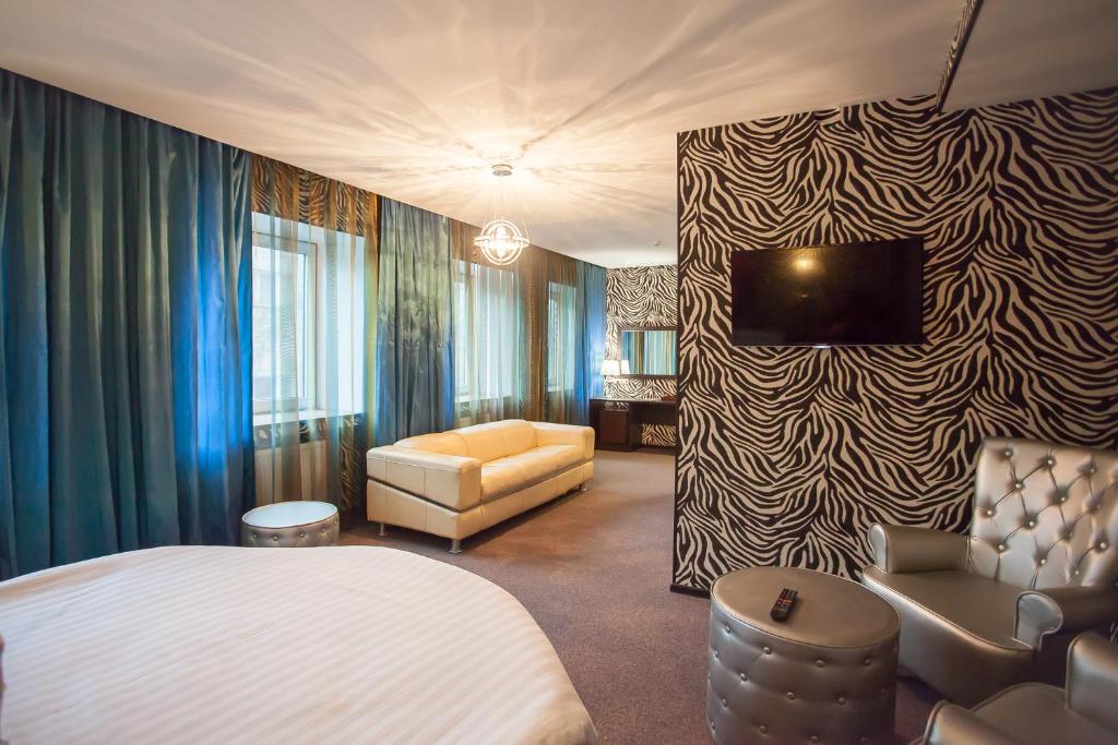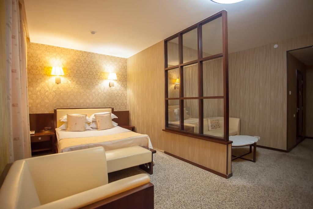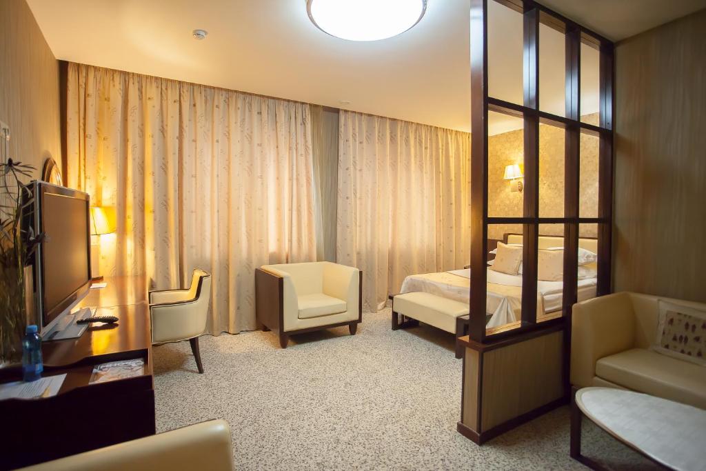 В «Номерах Делюкс» 39 кв.м. Просторный и элегантно оформленный люкс с телевизором и собственной ванной комнатой с бесплатными туалетными принадлежностями и большим зеркалом. Также имеется гостиная зона, отделенная стеклянной перегородкой.