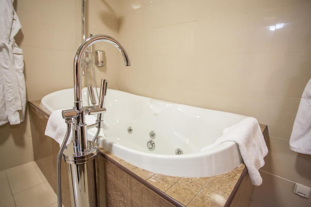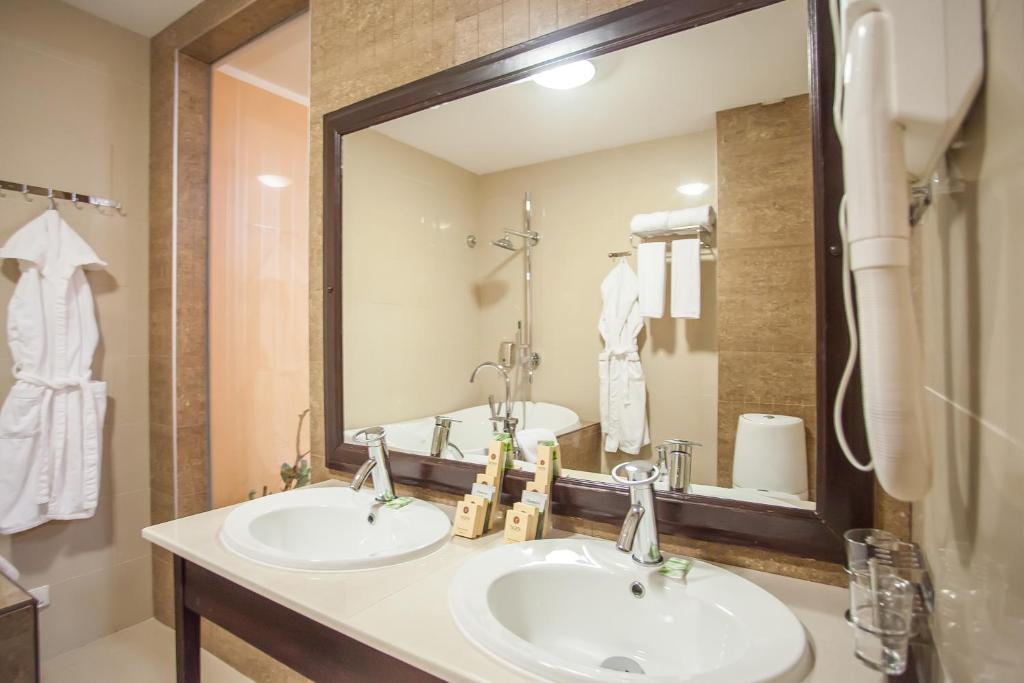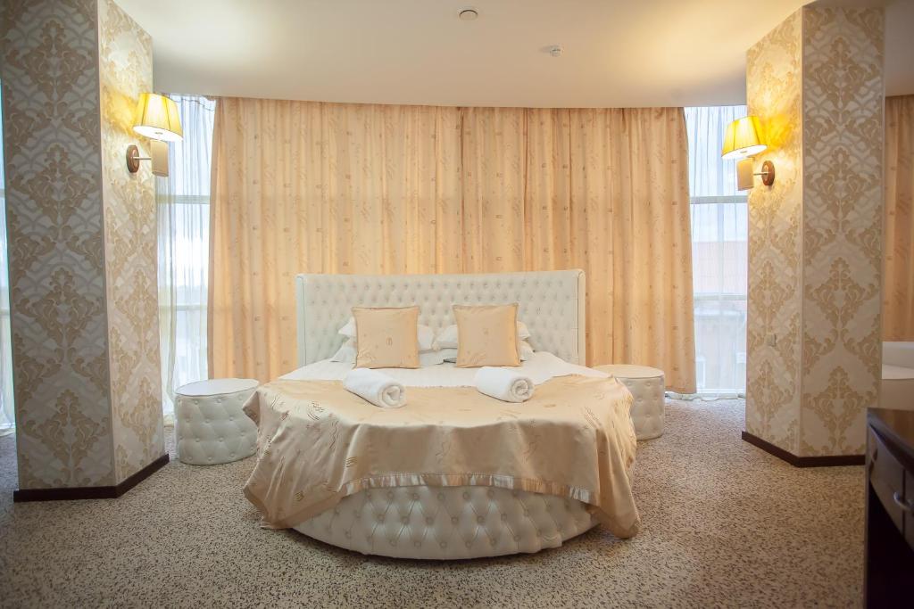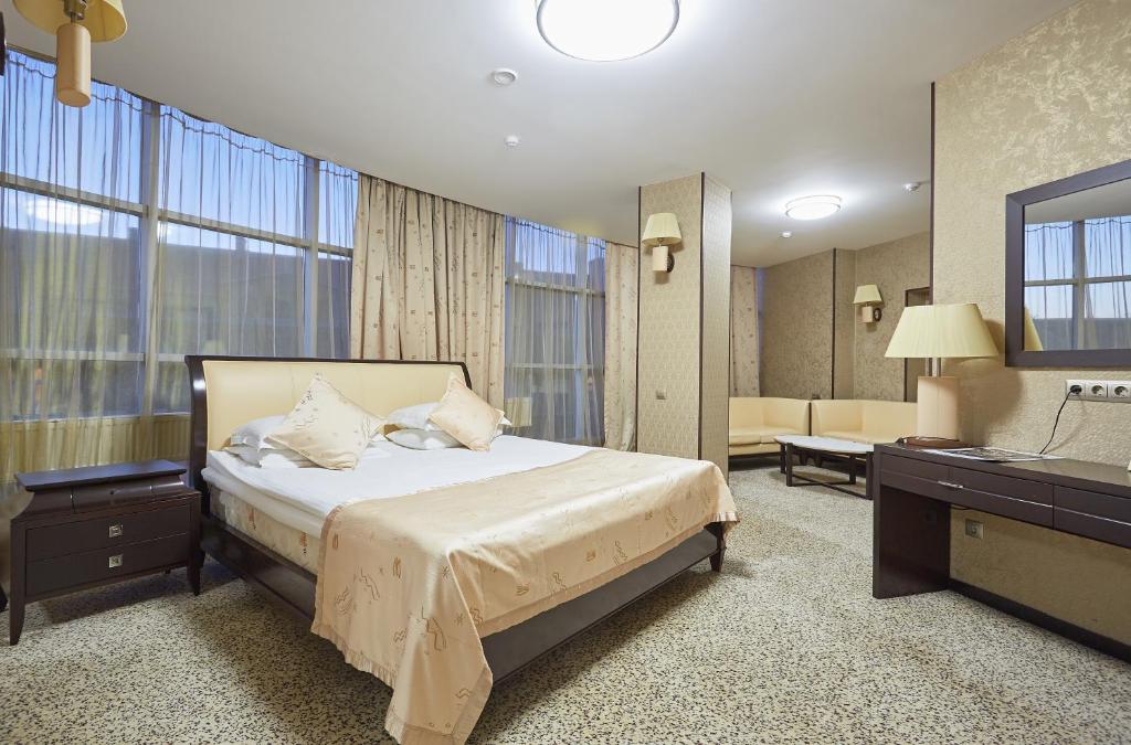 В «Номерах Люкс» 68 кв.м. Очень большой и элегантный номер-студия с панорамным видом, стильной ванной комнатой, 2 диванами и большим телевизором с плоским экраном.